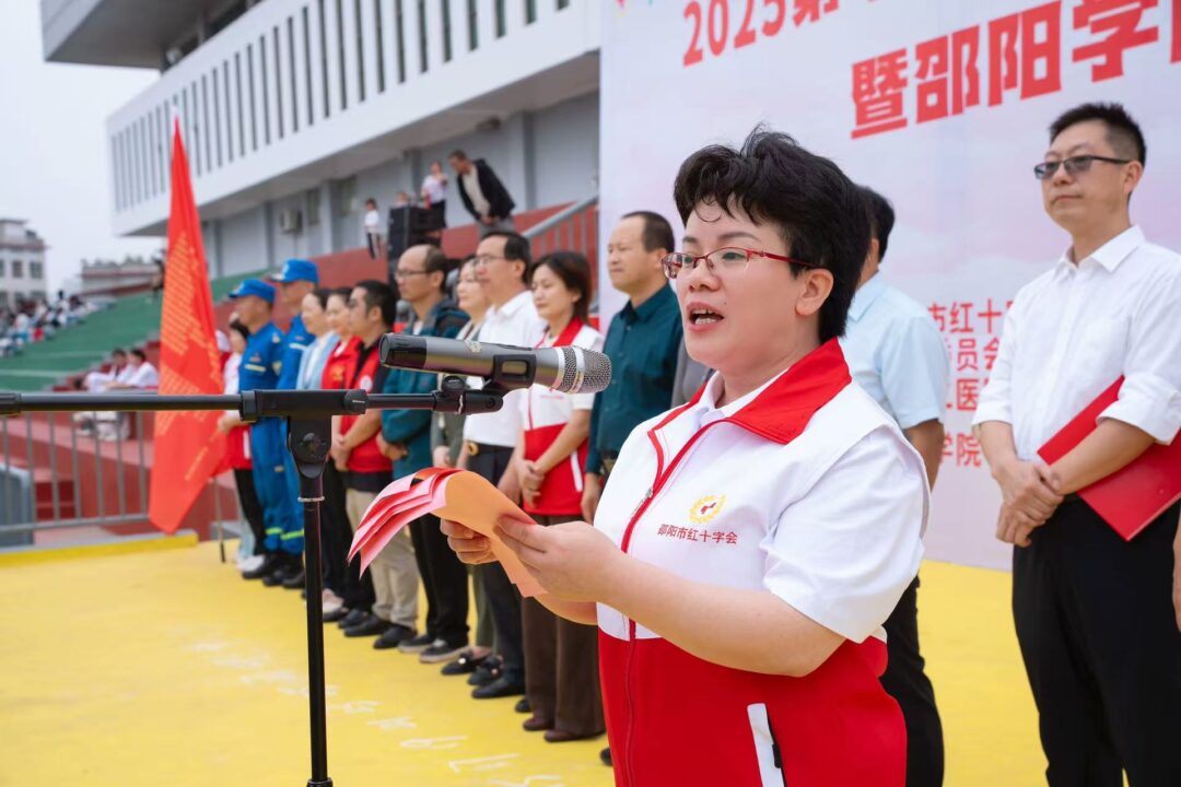 启动仪式上,邵阳市红十字会专职副会长邓彦科向邵阳学院附属第二医院党委副书记、院长肖体君授旗,并发表讲话,她指出此次培训是践行“生命至上”理念、建设平安校园的具体行动,更是助力“健康中国”的重要举措,并对新时代的有志青年寄予殷切期盼,希望参与培训的同学们熟练掌握急救技能,从“旁观者”变为“守护者”。