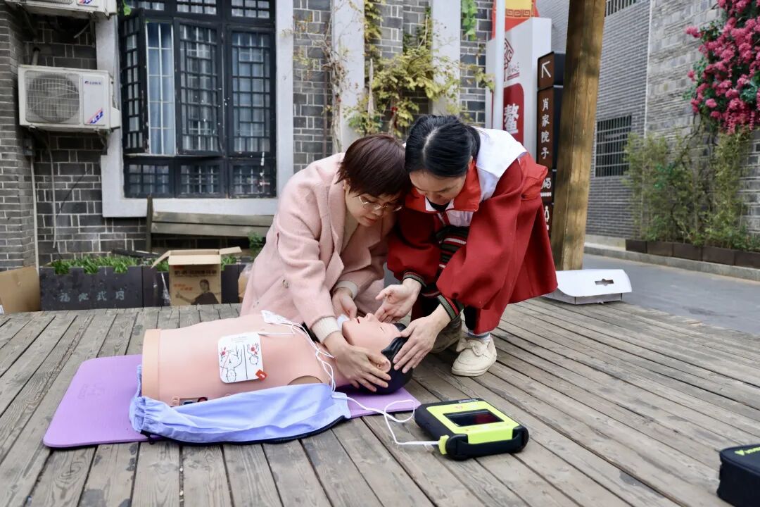 安装现场,武冈市红十字会救护师向周边居民详细讲解了心肺复苏、人工呼吸等急救知识,并演示了AED的使用方法与注意事项。